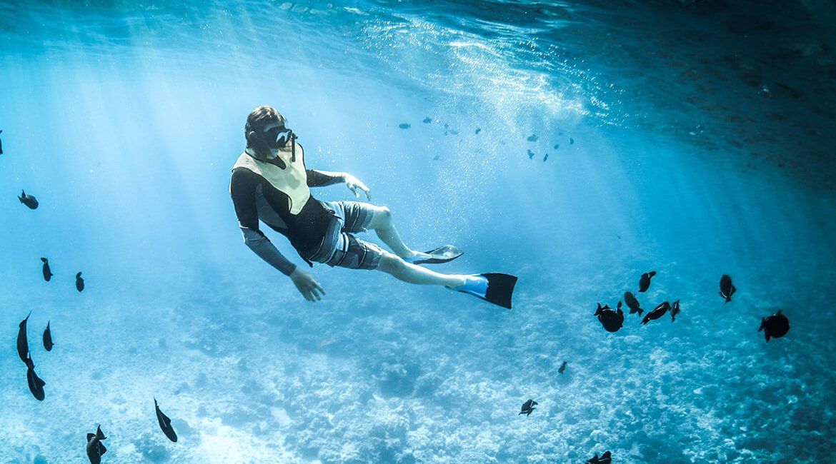 Scuba diving is fairly easy to figure out what is: strap a tank on your back and breathe from it under water, and by default, you’re scuba diving. But remove the tank and things get a lot murkier, and often, terms like snorkeling, free diving, and skin diving is used interchangeably. Snorkeling is arguably the most popular activity of the bunch. Thousands and thousands of snorkelers take to the water every year on holidays or in their home waters. Snorkeling is defined as an activity where the participants use snorkel fins, a snorkel mask, snorkel, and possibly a buoyancy vest to help them remain afloat without strain. Now a days, many snorkelers also go for the full face snorkel option.